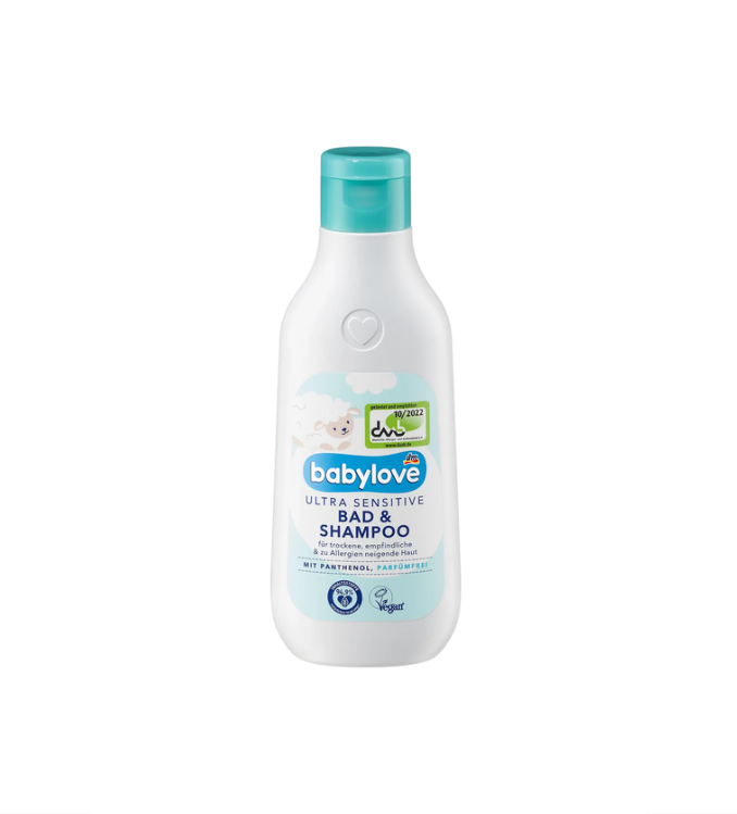 Le bain et shampooing 2 en 1 Ultra Sensitive de babylove a été spécialement conçu pour la peau de bébé sèche, sensible et sujette aux allergies.