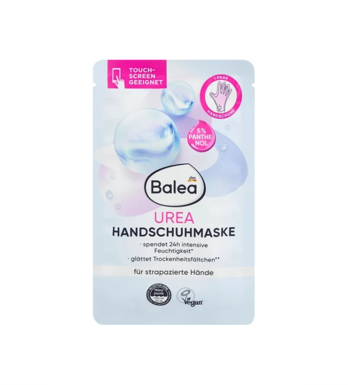 Le masque pour les mains Balea avec urée, acide hyaluronique et vitamine E apporte une hydratation intense de 24 heures et réduit immédiatement les sensations de tension aiguës.