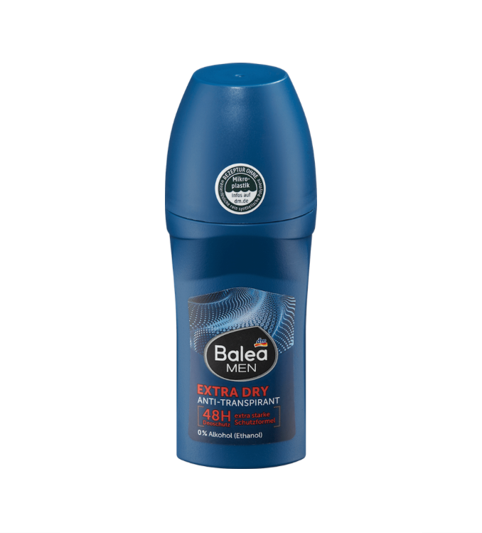Le déodorant anti-transpirant Roll-On extra dry de Balea MEN contient une protection déodorante extra forte et est doux pour la peau.