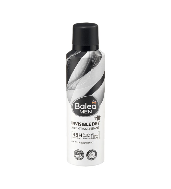 Avec le spray déodorant antitranspirant Invisible Dry de Balea Men, la protection contre les odeurs désagréables se fait sans laisser de traces.