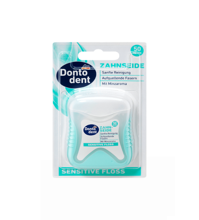Le fil dentaire Dontodent Sensitive Floss gonfle à l’utilisation, nettoyant ainsi les dents sensibles et les gencives sensibles de manière particulièrement douce et en profondeur. Le fil dentaire convient également aux espaces interdentaires plus larges, aux dents sensibles et aux porteurs de prothèses, d’implants et de broches. De plus, elle revigore avec un goût rafraîchissant de menthe.