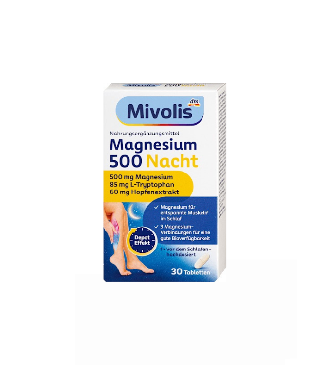 ¹Le magnésium contenu dans Mivolis Magnésium 500 Nuit contribue au fonctionnement normal des muscles et des nerfs.