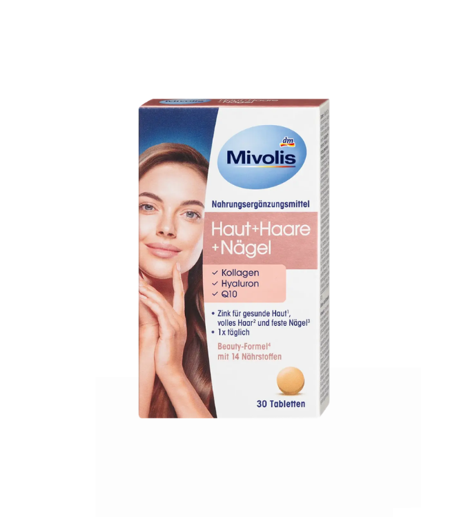 Une peau saine, des cheveux épais et des ongles solides façonnent l’apparence et sont des signes visibles de vitalité, de jeunesse et d’un mode de vie sain. Mivolis Peau+Cheveux+Ongles contient du collagène, de l’acide hyaluronique, de la coenzyme Q10 ainsi qu’une formule spéciale de 14 nutriments coordonnés. Le zinc, la vitamine A, la vitamine B2, la niacine et la biotine contribuent au maintien d’une peau normale. La vitamine C contribue également à la formation normale de collagène pour une fonction normale de la peau. Le zinc et la biotine contribuent au maintien de cheveux normaux. De plus, le cuivre contribue au maintien de la pigmentation normale des cheveux et soutient le maintien des tissus conjonctifs normaux. Le zinc contribue au maintien d’ongles normaux. De plus, la vitamine C et la vitamine E contribuent à protéger les cellules contre le stress oxydatif. Le fer et l’acide folique jouent un rôle dans la division cellulaire. Une prise régulière de ces nutriments peut aider à soutenir durablement la beauté de l’intérieur.